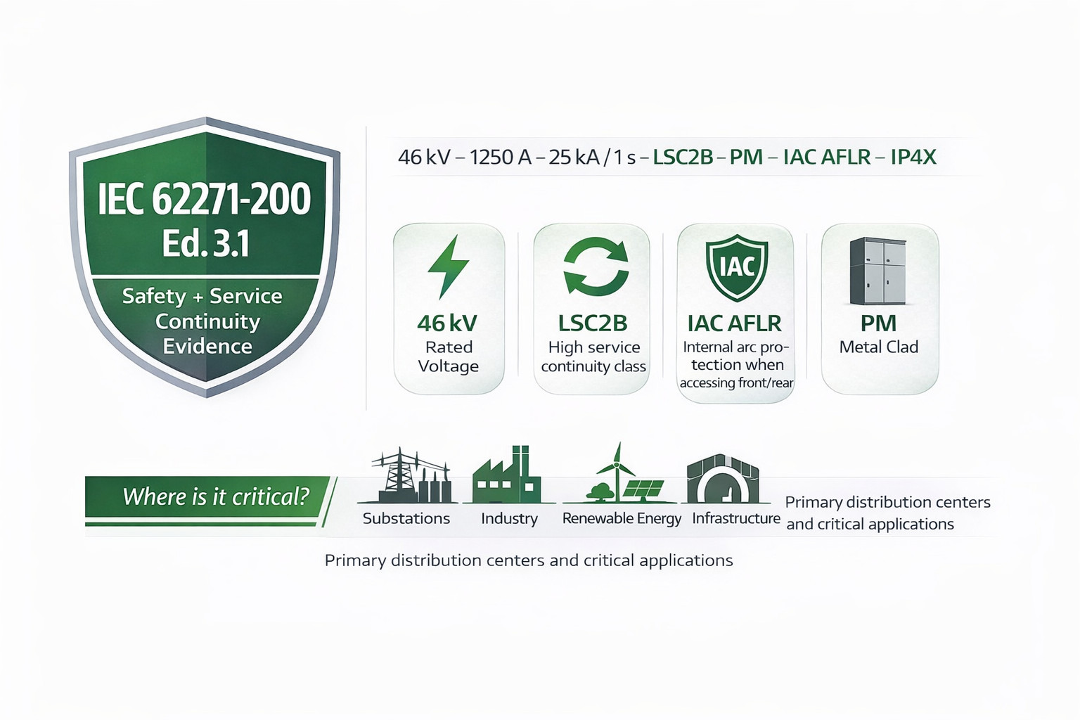 46 kV – 1250 A – 25 kA / 1 s – LSC2B – PM – IAC AFLR – IP4X, confirming that the design provides high service continuity and operator safety under worst-case internal arc fault conditions.